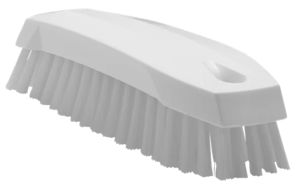 | This small, light-weight brush has a broad head and an ergonomically angled handle. This design raises the user’s hand from the cleaning surface reducing the risk of injury. Used for cleaning small surface areas on production equipment, tables, etc. |